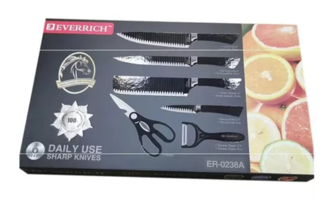 Este juego incluye una variedad de cuchillos esenciales, cada uno fabricado con acero inoxidable de alta calidad para un corte preciso y duradero.